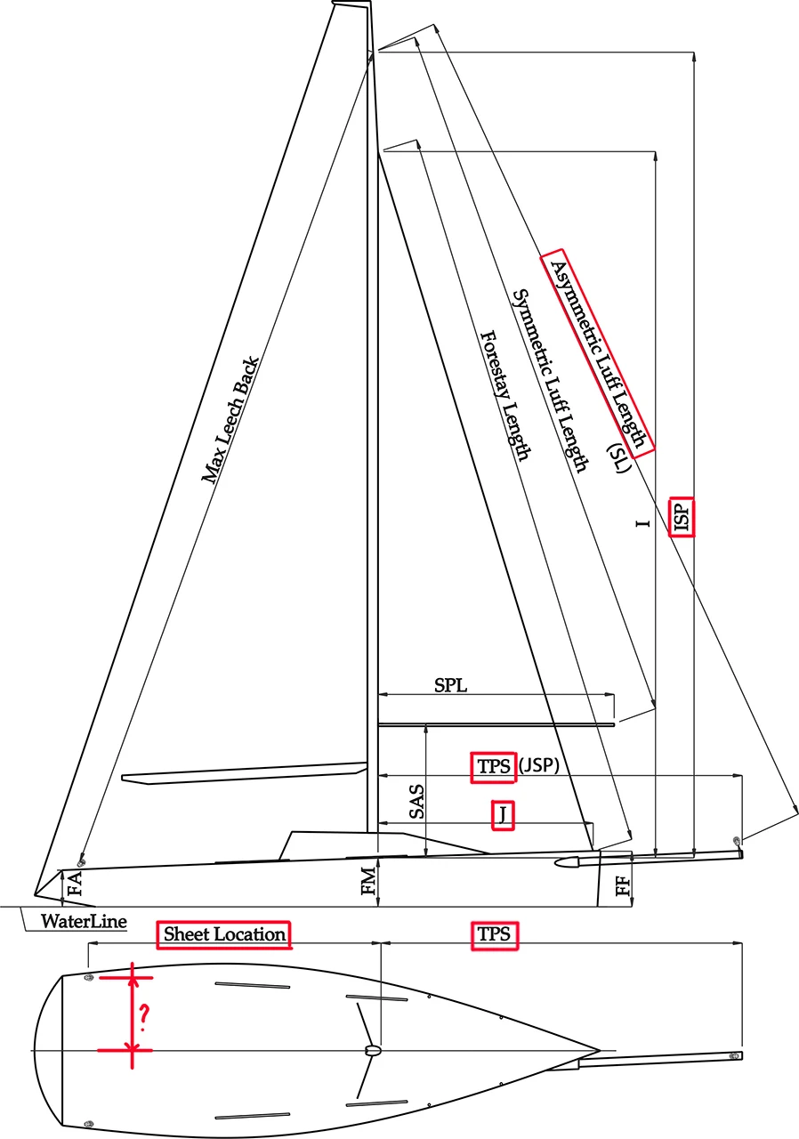 A very important thing is to correctly determine the size of the asymmetric which would be suitable for your sailboat. To do this, you will need to measure the distance from the spinnaker halyard exit on the mast to the tack attachment point on the bow or extended bowsprit of a boat. Please, bear in mind that this distance will be further reduced by shackles, halyard knot, etc. It is also advisable to leave some free length of the halyard to allow for sail adjustment.