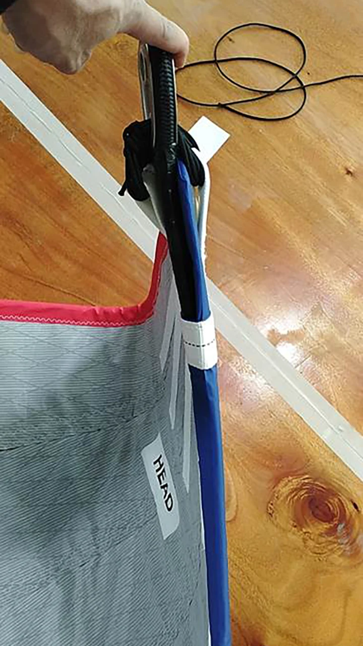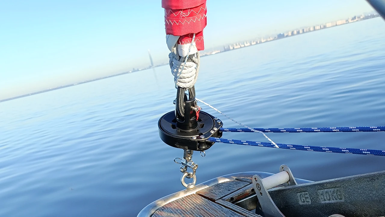 Вы можете взять рулетку с кольцом на начале, чтобы закрепить ее на фале и поднять. Сняв замер у крепления галса, Вы получите нужное расстояние за вычетом узла на спинакер-фале и такелажной скобы или карабина.
