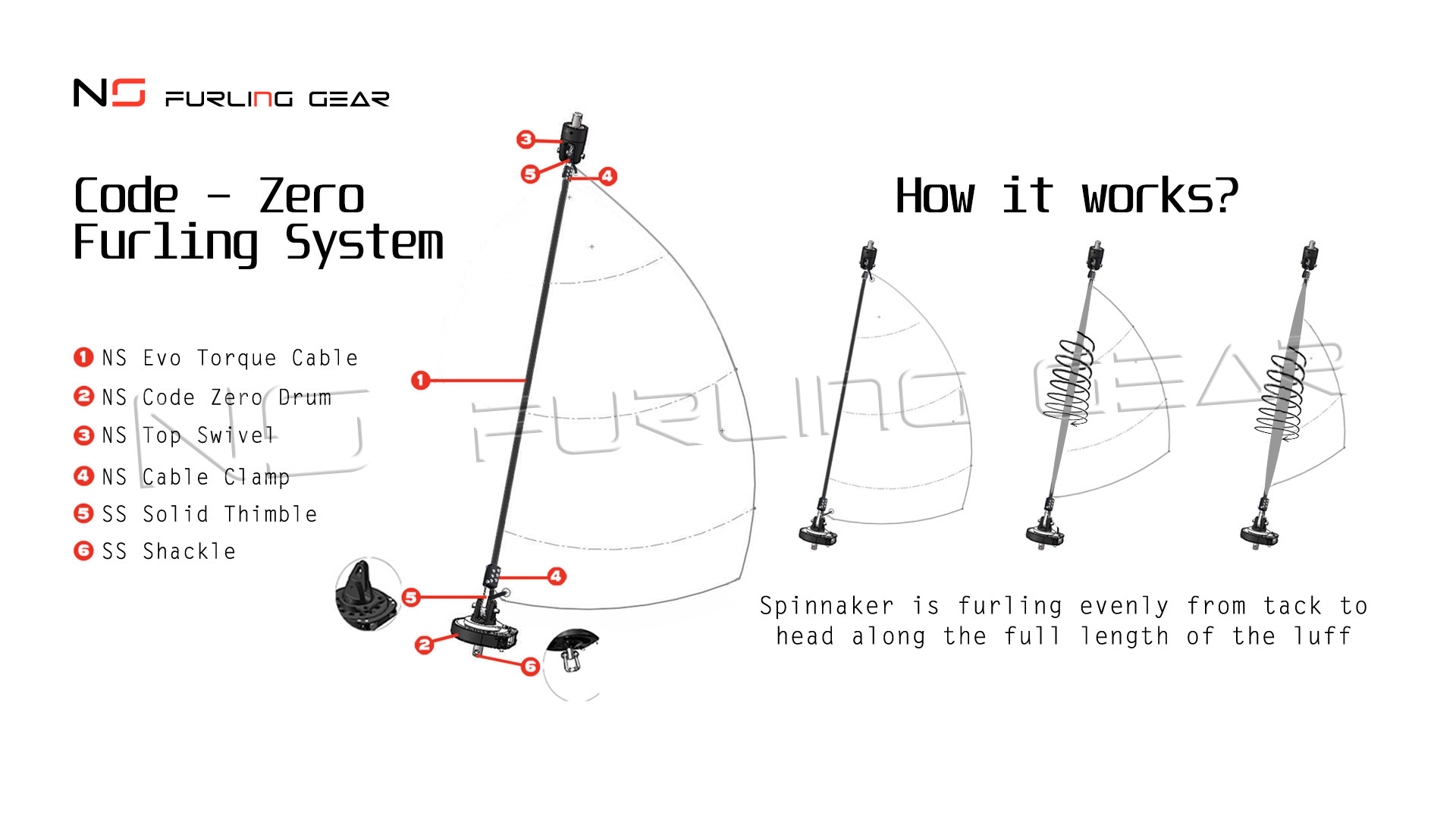 Code Zero Furler NS Furling Gear 2.5 is designed to handle sails with a “stretched” luff like Staysails, Code Zero and Code 1, Drifter, sailing catamaran Screecher, cruising asymmetric Spinnaker or Gennaker etc. For a large asymmetrical spinnakers with a “soft” luff you need to use the Top-Down furling system.