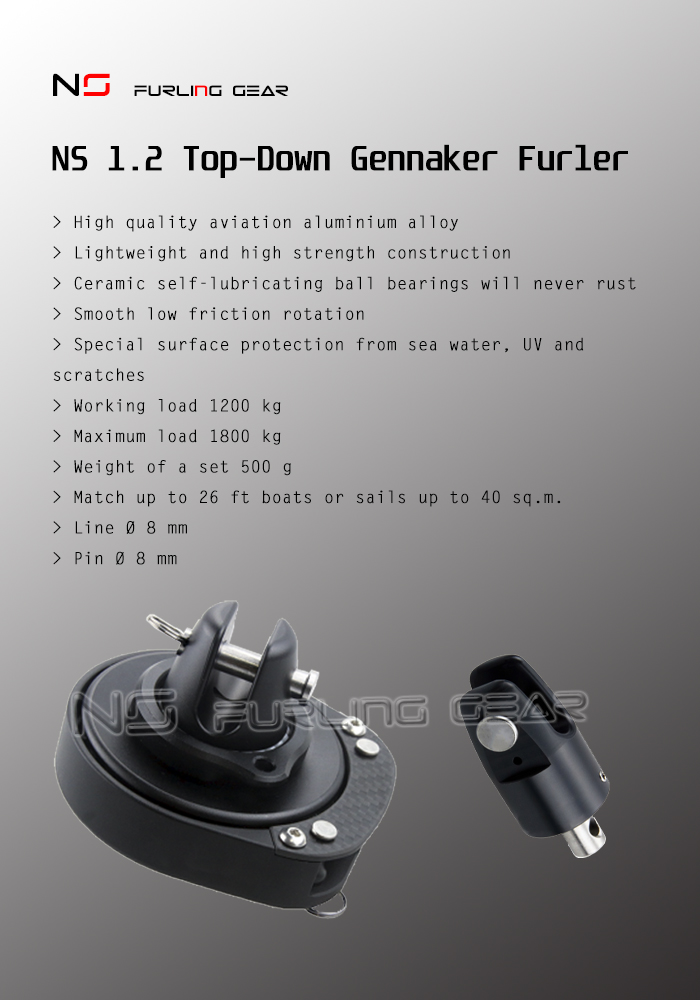 Top-Down Spinnaker Furler NS Furling Gear 1.2 Top-Down is designed to handle sails with a «soft» luff like asymmetrical spinnakers and gennakers, Code 2-6, reachers, large A-sails etc.