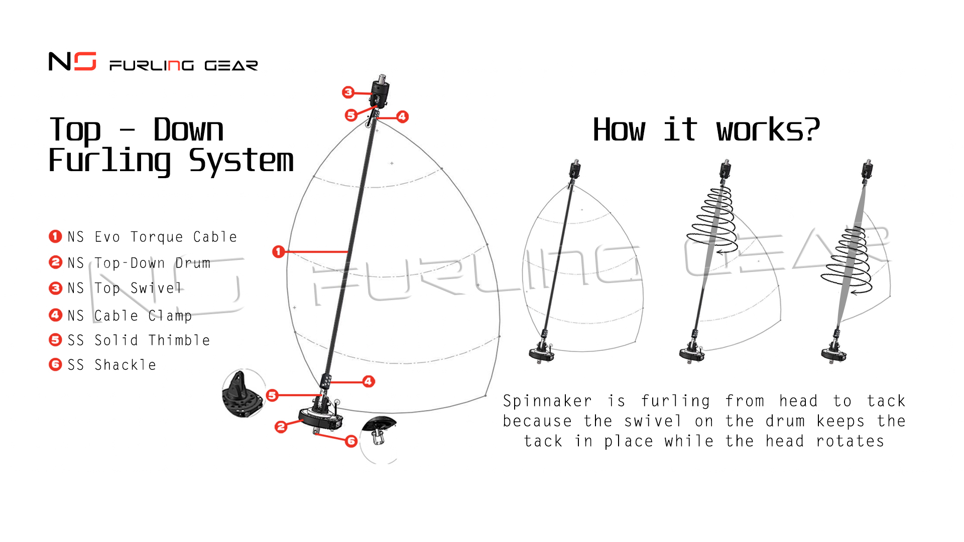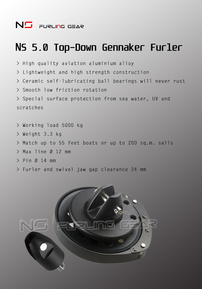 Top-Down Spinnaker Furler NS Furling Gear 5.0 Top-Down is designed to handle sails with a «soft» luff like asymmetrical spinnakers and gennakers, Code 2-6, reachers, large A-sails etc.